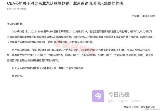 第二个消息,CBA官方发布重要罚单,北京北汽男篮和青岛崂山啤酒男篮的赛后,赵睿因在社交媒体发表不当言论,被停赛三场 罚款五万。同时对北京北汽男篮处以核减联赛经费5万的处罚。