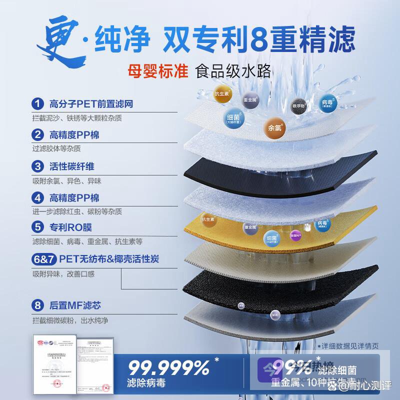 全面净化能力:凭借先进的8重净滤技术,吸附和去除重金属、细菌等各种污染物,使家中水源安全可靠。这意味着,无论是煮饭还是饮用,都可放心使用。本设备经得起多重考验,过滤后水质清澈、干净,为全家提供安全健康的饮水体验,有效防止水源带来的健康隐患。