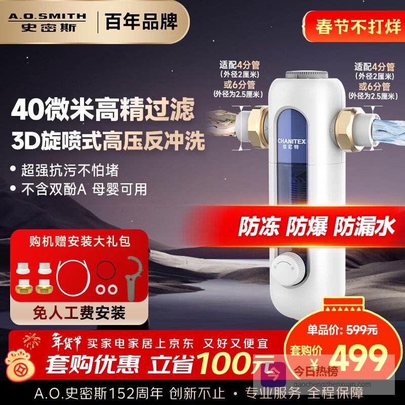 【京东自营】史密斯佳尼特前置过滤器自来水过滤家用净水器全屋净水自动反冲洗防爆滤瓶小海星CPF-T6¥