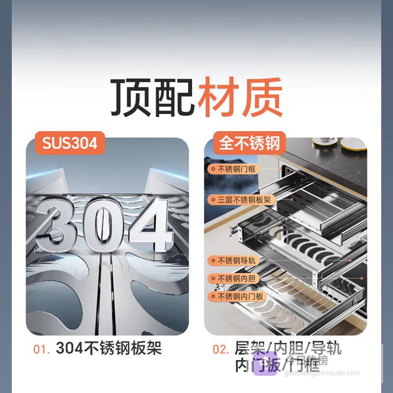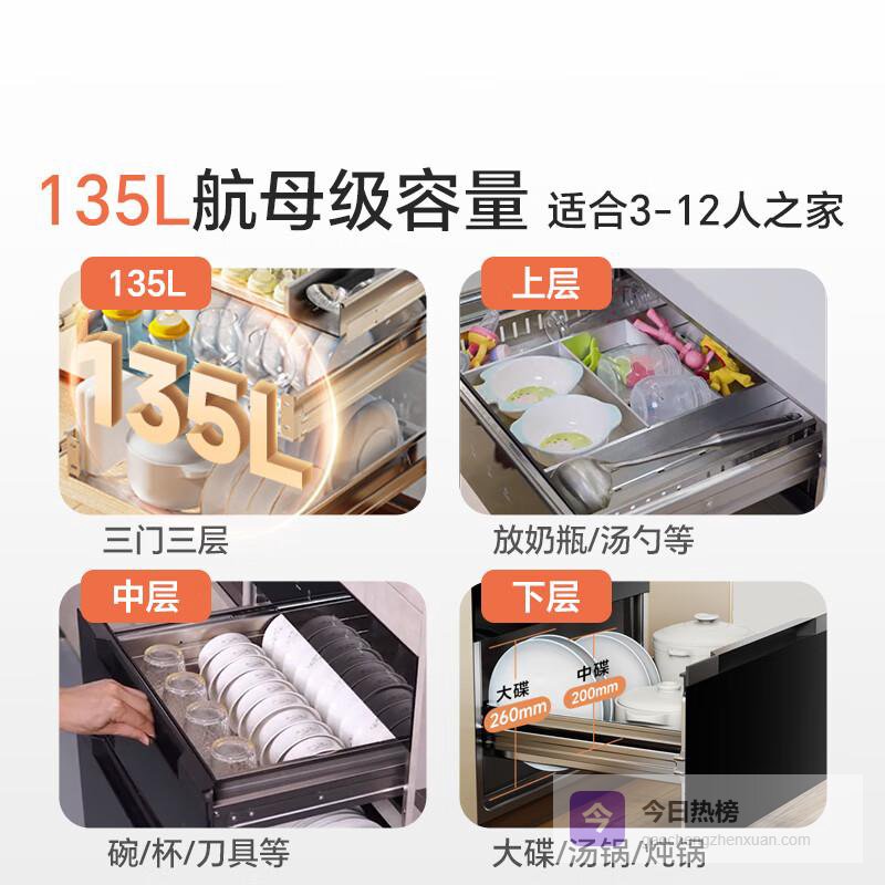 怎么选:- 先量橱柜,再选容量:别盲目买大,比如橱柜净宽58cm,就只能选宽度≤58cm的消毒柜,否则装不进去;- 考虑餐具类型:如果家里常用深汤碗、大盘子,选“宽腔设计”(内部支架间距大)的型号,避免碗筷放不下。