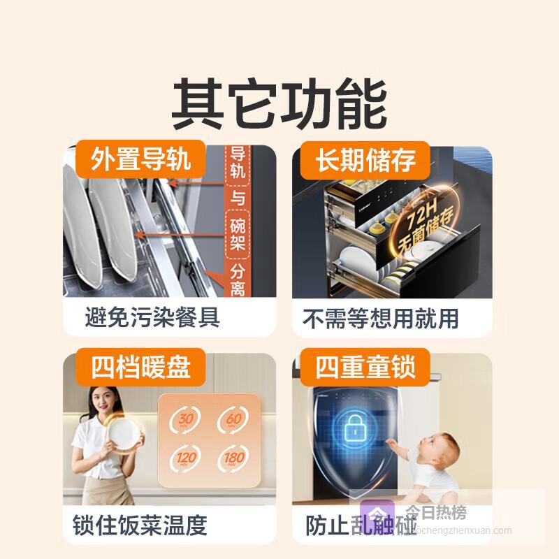 1. 入门级:基础消毒+定频烘干,适合小家庭过渡核心特点:容量60-80L,消毒方式以“高温+紫外线”为主,烘干多为定频或自然风,价格在1000-2000元;优点:价格低,满足基础消毒需求,适合餐具少、预算有限的1-2人家庭;缺点:烘干效果一般(潮湿天气可能不彻底),功能单一(无智能控制、童锁等);适合人群:租房党、小家庭过渡期使用,对消毒要求不高。