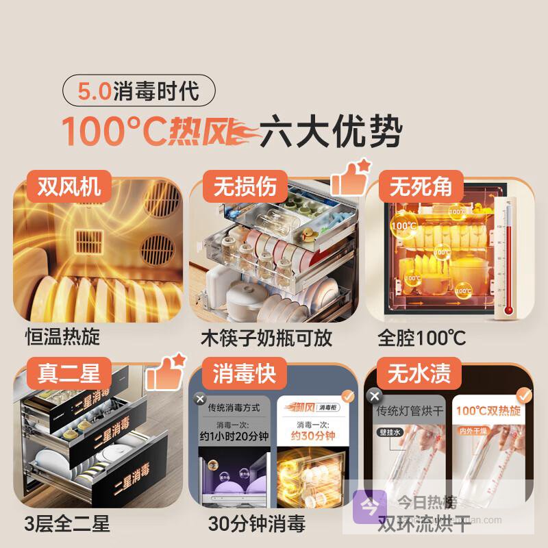 拥有100L大容量双层空间,轻松容纳碗筷、餐具及婴幼儿用品,满足全家日常消毒需求。