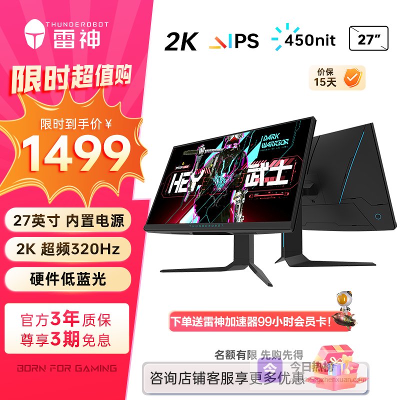 雷神(ThundeRobot)黑武士27英寸2K 320Hz 硬件低蓝光 Fast IPS HDR400nit 升降旋转 专业电竞游戏电脑显示器 DQ27F300L-27英寸/2K/320HZ¥