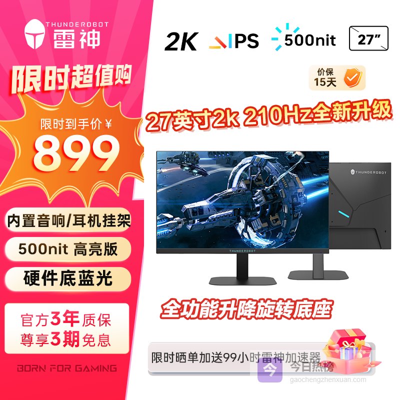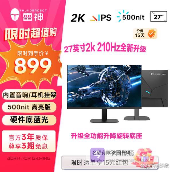 雷神27英寸2K 210Hz Fast IPS 硬件低蓝光 升降旋转HDR500nit峰值内置音箱电脑显示器JQ27F210L-Pro¥