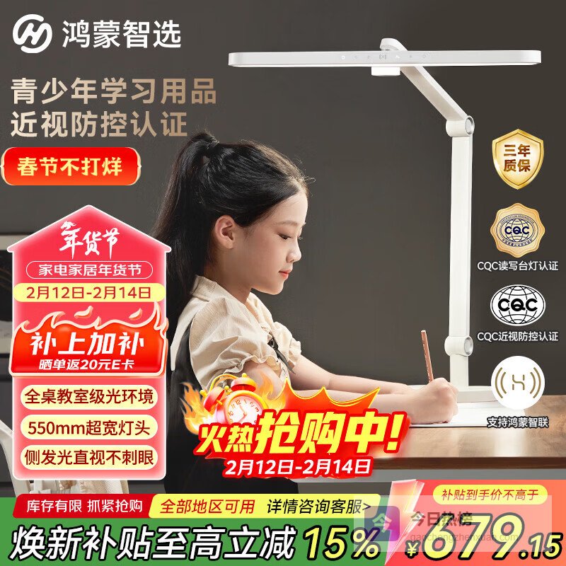 十、鸿蒙智选▶ 超宽照明范围:灯头比普通台灯长出20%,可以轻松照亮大约1.2米宽的大书桌,帮你创造类似教室的宽敞光环境,让你无死角都能看得清楚。