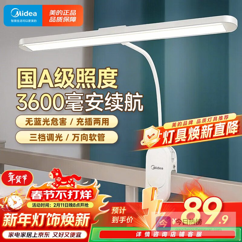 美的(Midea)矩形夹子灯学生学习家用宿舍护眼阅读灯卧室床头灯LED充电小台灯¥
