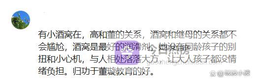 有小酒窝在,高和董的关系,酒窝和继母的关系都不会尴尬,酒窝是最好的润滑剂,她没有同龄孩子的别扭和小心机,与人相处落落大方,让大人孩子都没情绪负担。归功于董璇教育的好。