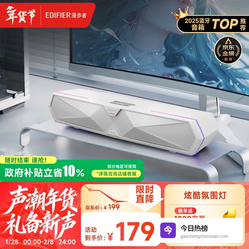 1、漫步者Halo SoundBar这款漫步者Halo SoundBar音响,双全频单元和对称式倒相管,保证了音质的纯净和低音的浑厚。而且它还有三种EQ模式可选,不管是玩游戏听声辨位,还是听音乐享受人声,或者看电影追求空间感都可以满足你。连接方式也方便,蓝牙5.4稳定快速,USB一线连更是即插即用,双模式切换,省心!