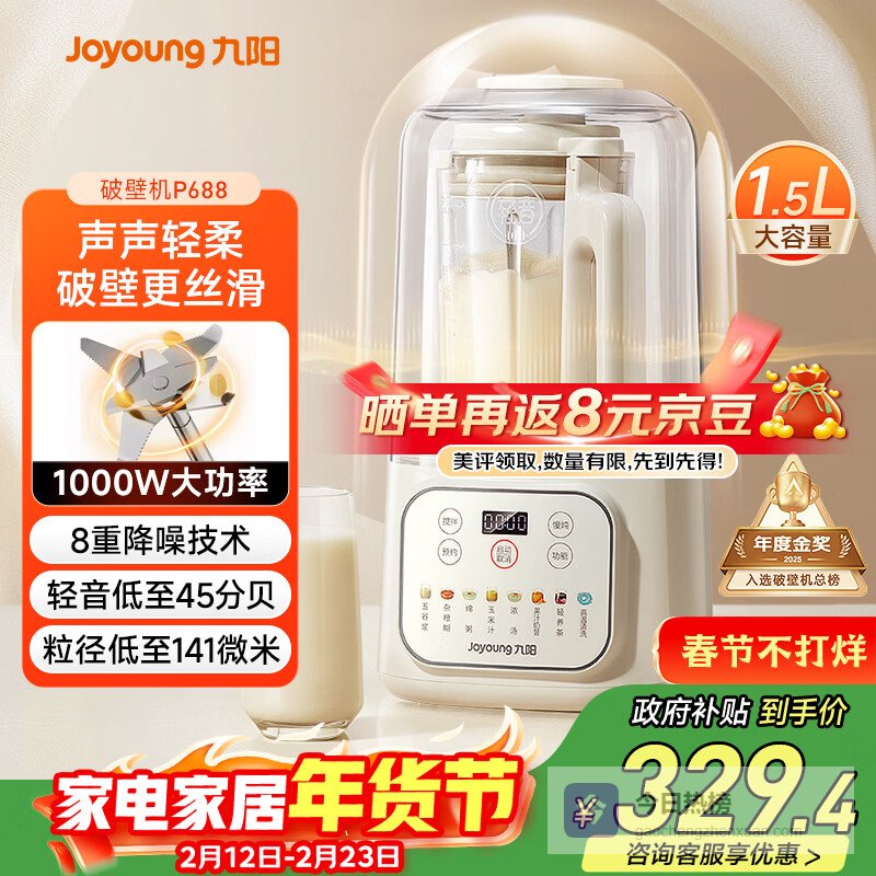 【京东自营】九阳1.5L低音破壁机家用全自动豆浆机轻音45分贝2-4人降噪榨汁料理机五谷杂粮破壁机P¥