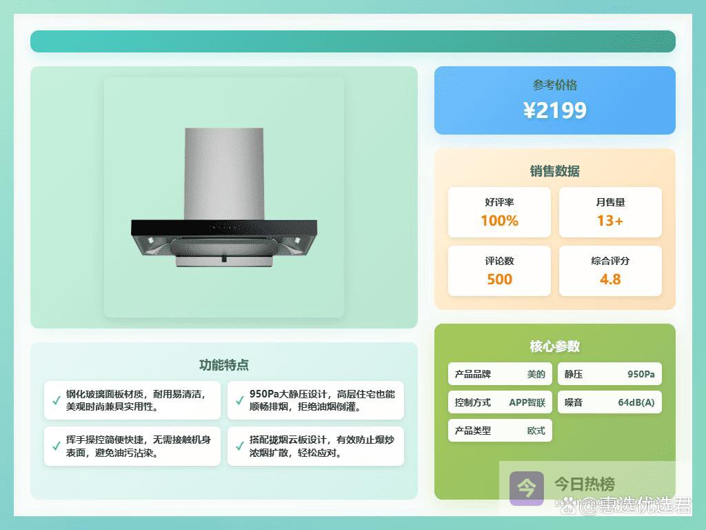 选美的家用油烟机,首先得看准吸力。毕竟,谁也不想炒个菜,搞得整个家都乌烟瘴气的。美的油烟机在吸力方面确实下了功夫,像25m³/min甚至26m³/min的爆炒大吸力,对于经常在家做饭,尤其是喜欢爆炒的朋友来说,那绝对是刚需。 还有就是静压,住在高层的朋友们注意了,一定要选静压大的,不然油烟倒灌就麻烦了。美的有些型号能达到950Pa的大静压,排烟效果那是杠杠的。当然,吸力也不能盲目追求大,噪音也是要考虑的,最好选择带有降噪设计的,这样炒菜的时候也能享受安静的环境,心情也会好很多。