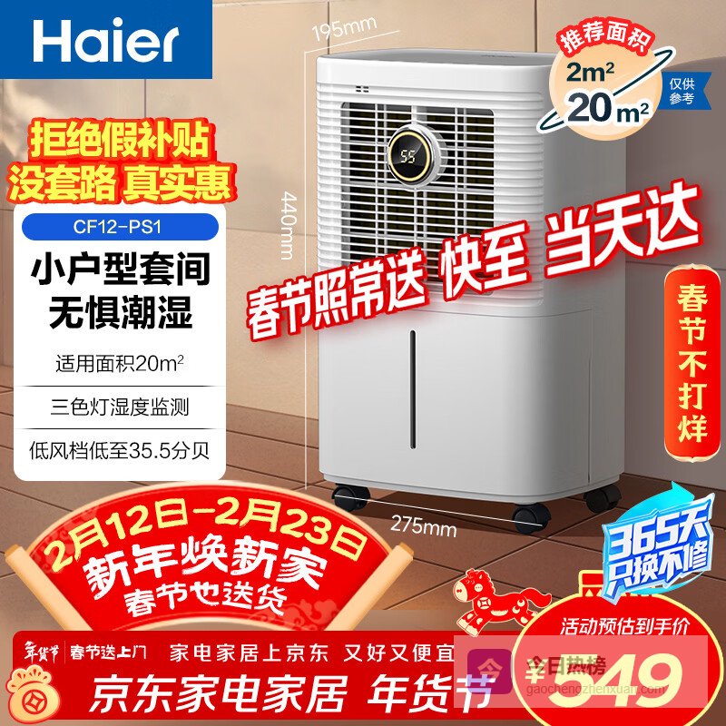 海尔(Haier)除湿机/抽湿机 除湿量12升/天2-20㎡家用轻音抽湿器卧室干燥机地下室回南天 CF12-PS1¥