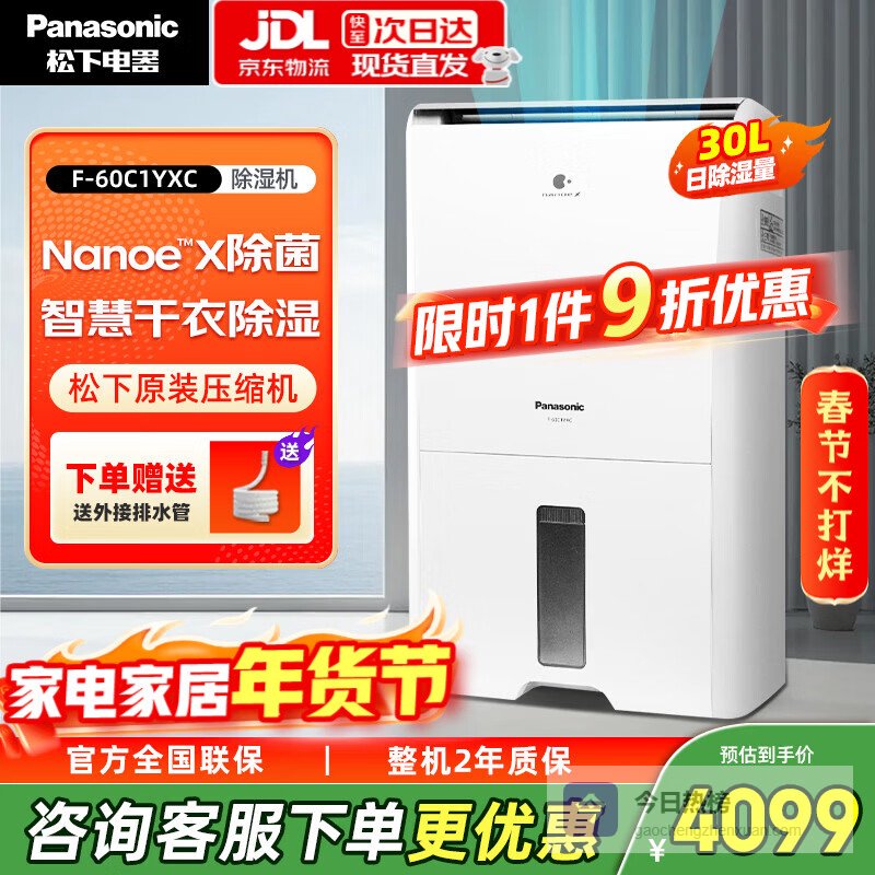 松下(Panasonic)除湿机/抽湿机 家用除湿干衣防霉除菌净化卧室地下室轻音吸湿器 大功率除湿空气干燥机 30L/天 40-70㎡ 除菌款F-60C1YXC¥