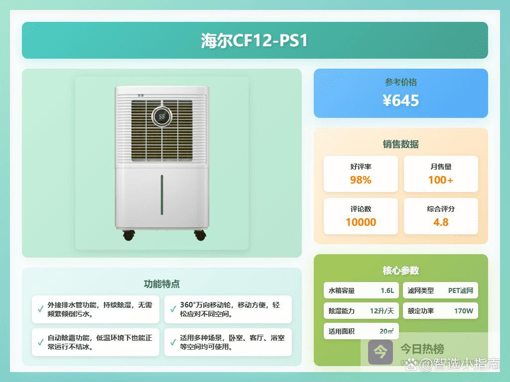 十、海尔▶ 智能湿度监控:这款海尔CF12-PS1除湿机配备了三色灯实时监测功能,随时了解室内的湿度情况。不管是湿度过高还是偏低,LED灯会显示不同颜色提醒你,特别方便,不用一直盯着显示屏。让你轻松掌握环境变化,保持干爽。