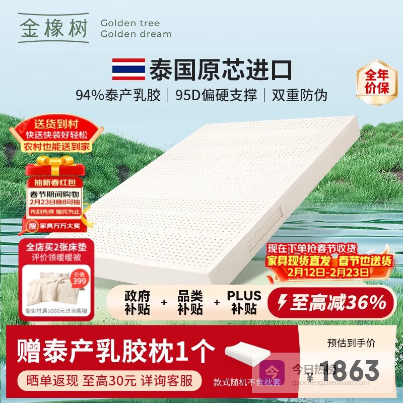 【京东自营】金橡树天然乳胶床垫泰国进口家用舒脊榻榻米垫子双人1.8*2米适中偏硬¥
