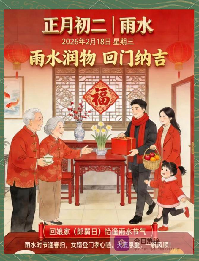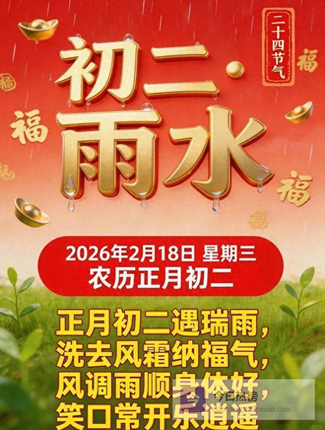 2026年2月18日,农历丙午马年正月初二,大年初二与雨水节气首次“肩并肩”,成为近百年一遇的超级吉日。老辈人常说:“雨水逢初二,金银财宝满堂溢。”把天文历法与人间烟火揉在一起,这天被赋予了“财福双收、亲情加厚”的厚重寓意。
