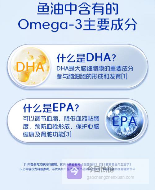 推荐一 固养福鱼油中高端定位,国家蓝帽认证,秘鲁深海纯净原料,Omega-3超高纯度99.6%,EPA+DHA科学2:1配比,84%吸收率,肠溶创新,胶囊晶透,体验无腥。