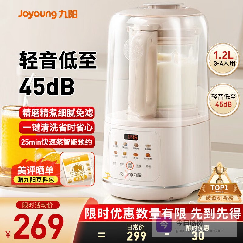 九阳(Joyoung)破壁机2025新款隔音罩轻音降噪家用豆浆机料理机全自动免煮免过滤五谷杂粮大容量早餐机榨汁机P725 【精磨精煮 触控彩屏】小巧好收纳¥
