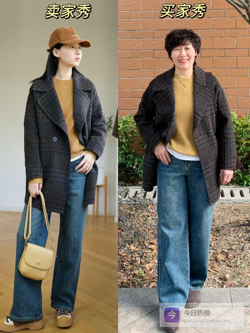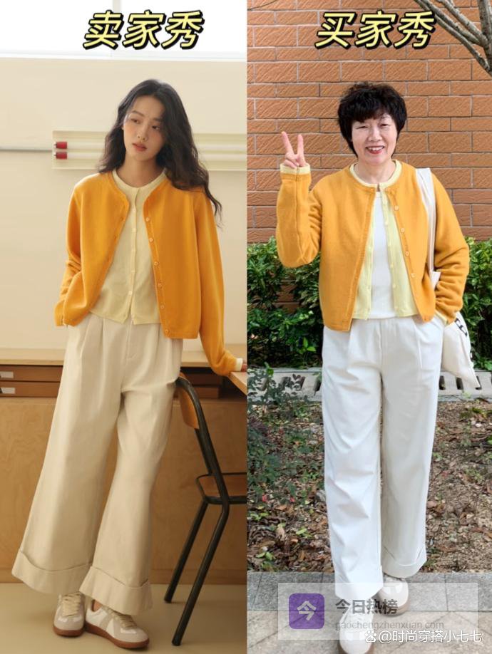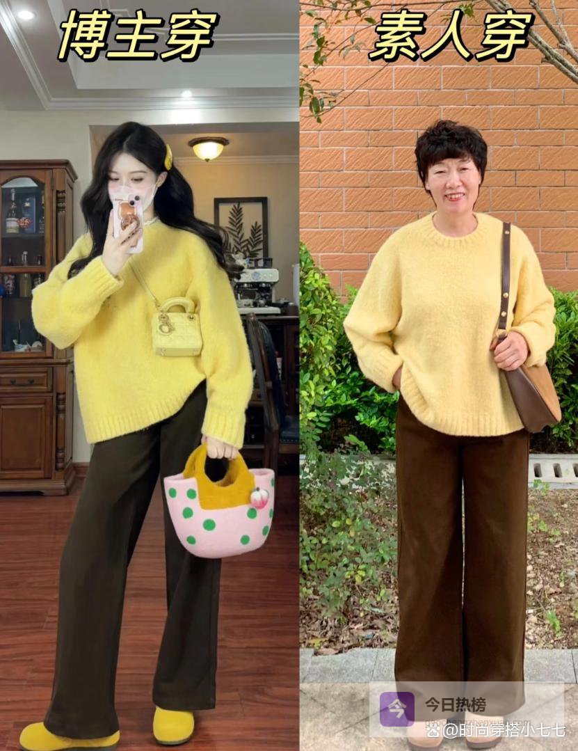 就像这件黄色的毛衣,下半身搭配的是一条棕色的裤子,这样的搭配被她直接照着穿到了身上。