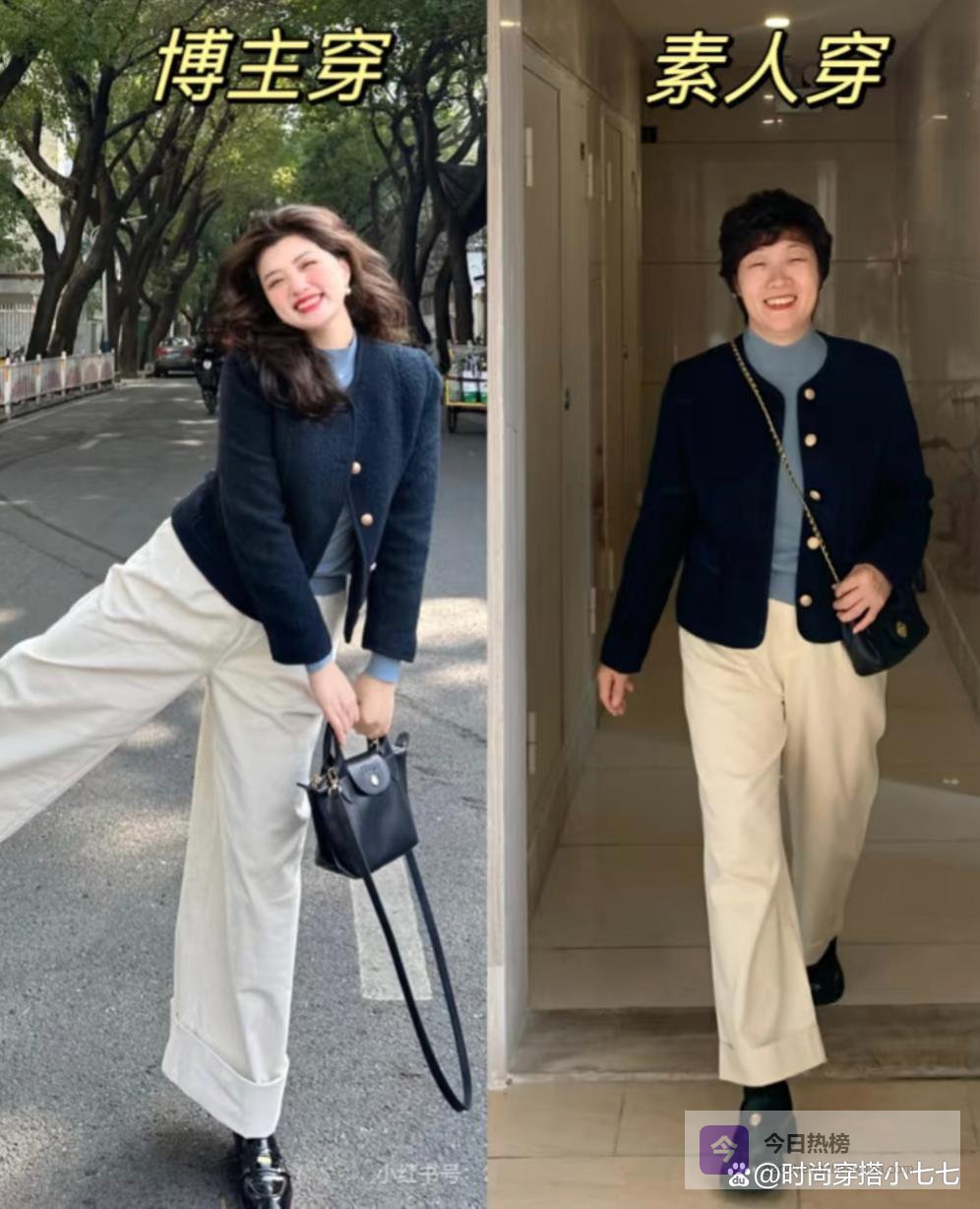 所以她把裤子换成了浅蓝色的阔腿牛仔裤,上衣保留了藏蓝色的款式(藏蓝色还有一定的显瘦效果)。