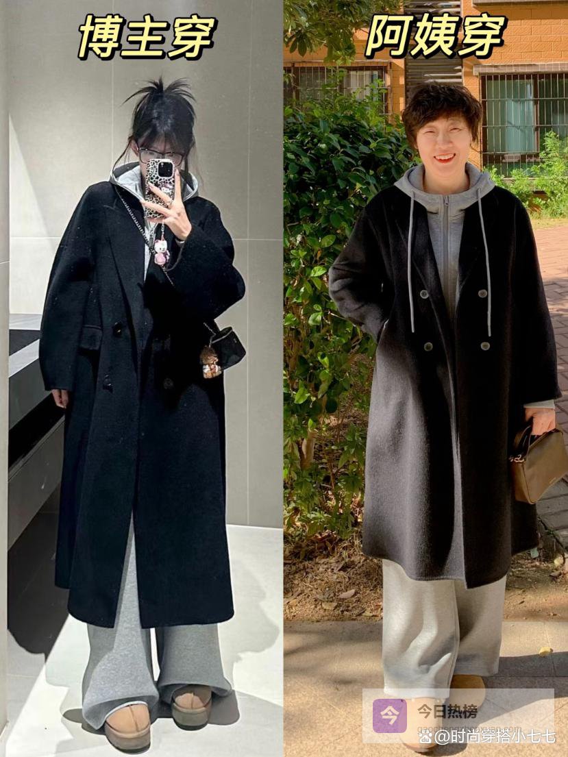 这里小院阿姨和借鉴的博主一样,把一件连帽卫衣选来当做内搭去做搭配。