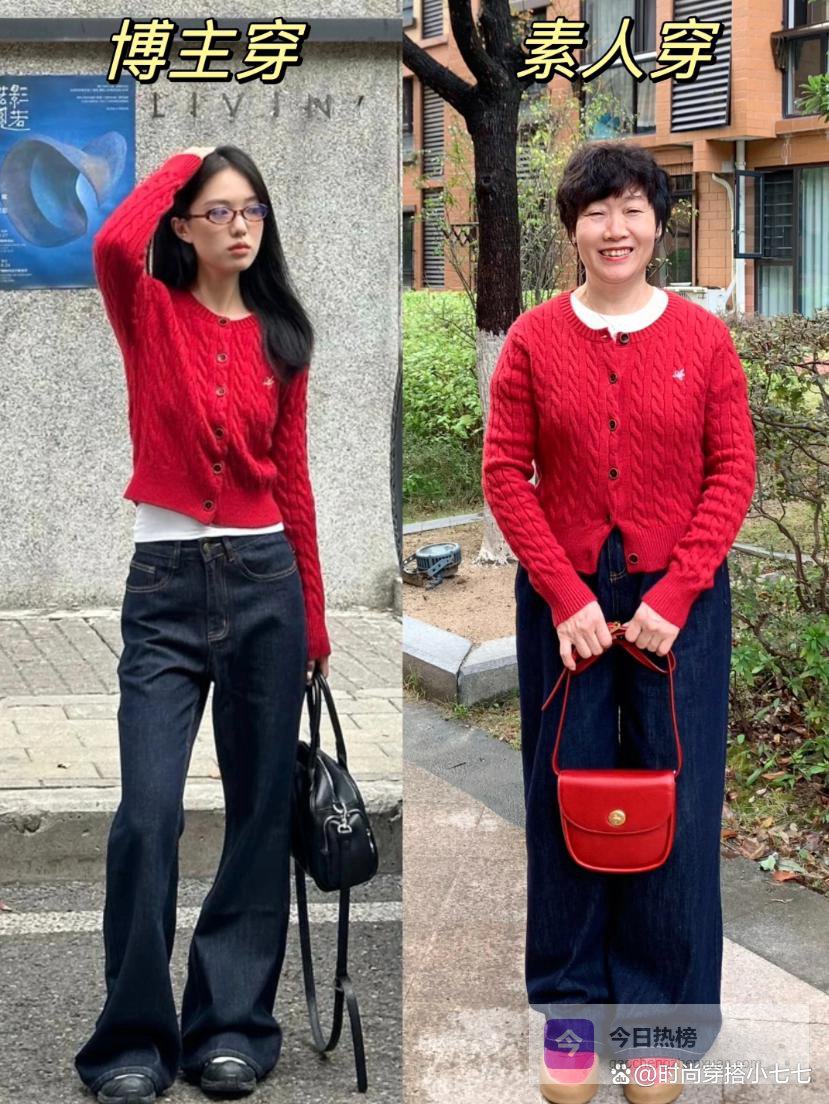 新春的时候,这样穿也很应景,颜色喜庆又不会显得过于张扬。