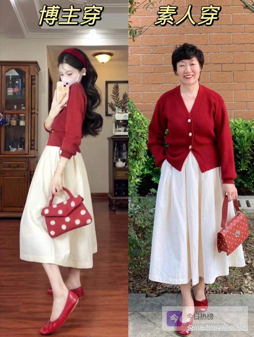 当然啦,也有直接照搬、没做改动的穿搭。就像上图这套,红色的针织衫搭配米白色的小腿半身裙,很简洁大方。