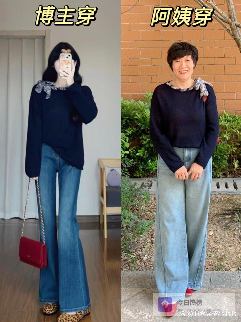 就拿下图这套来说吧,她借鉴的博主,穿的是一件藏蓝色的上衣,搭配了微喇裤。