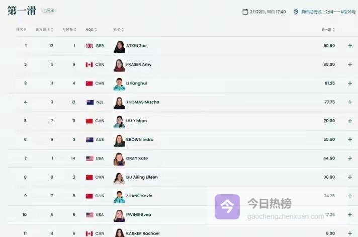 第一个意外出现在首轮。 第八位出场的卫冕冠军谷爱凌,在完成第一个高难度动作落地时就出现失误,严重打乱了后续节奏,最终只得到了30.00分,排名一度跌至第八。 而她的主要竞争对手,英国名将佐伊·阿特金则滑出了90.50的高分,暂列第一。 另一位中国选手李方慧以81.25分排在第三。 开局不利,金牌似乎正在远离。