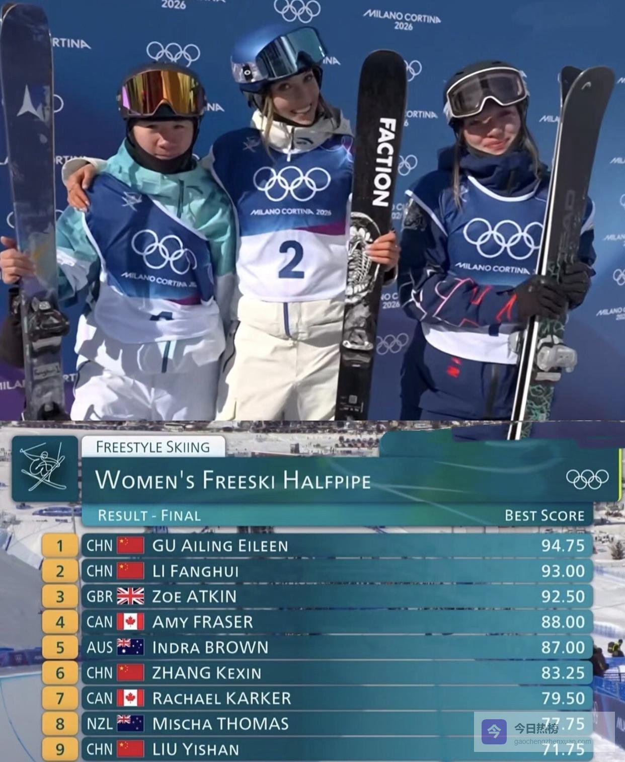94.75分! 当这个数字出现在大屏幕上的时候,你知道这意味着什么吗? 这不仅仅是一枚金牌,这是谷爱凌在2026年米兰冬奥会自由式滑雪女子U型场地技巧决赛中,用近乎完美的第三跳,为自己戴上的第二顶奥运桂冠。 更惊人的是,她和队友李方慧一起,让五星红旗第一次在冬奥会这个项目的领奖台最高处并排升起。 中国队包揽冠亚军,这背后是一场怎样的逆风翻盘? 这位23岁的姑娘,又在这一刻改写了多少项历史纪录?