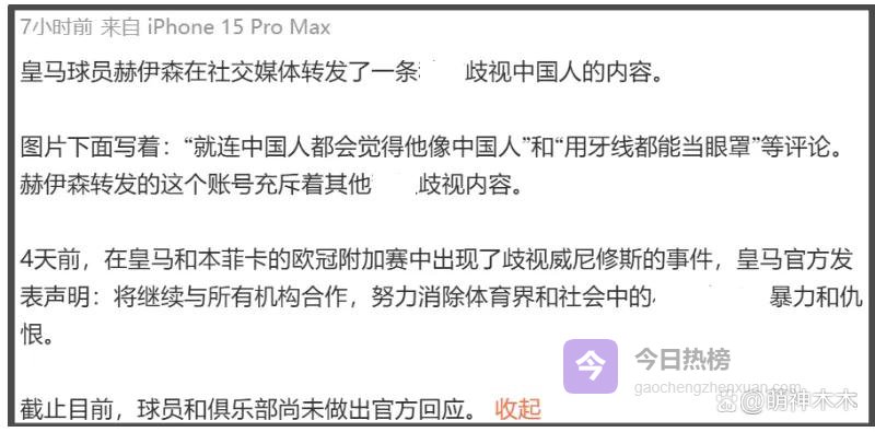 面对皇马俱乐部双标行为,中国网友愤怒了,赫伊森社媒评论区沦陷,他删除了相关动态,删除行为也意味着赫伊森了解到了舆论争议,但是依旧没有道歉。