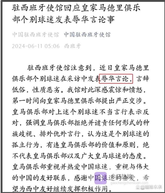 就在2024年,一位体育博主遭到皇马球迷公开歧视,对方引导他演唱侮辱中国女性的歌曲,后续网友还扒出涉嫌歧视的皇马球迷是皇马俱乐部高层的孙子。