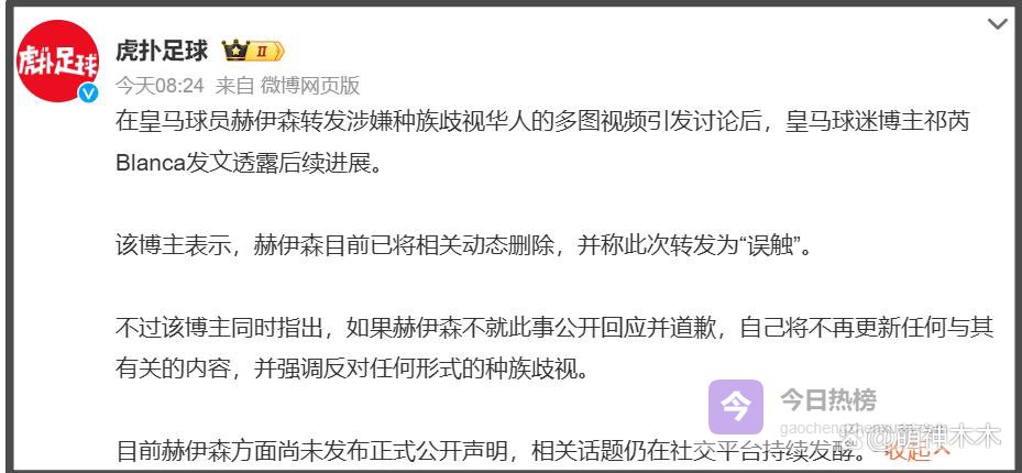 舆论升级过程中,有一位网红博主尝试联系皇马俱乐部和赫伊森本人,都没有得到正式回应,绕了一圈联系了赫伊森的队友,也就是皇马俱乐部其他球员,才被告知是赫伊森不小心碰到了才转发的,包括删除动态,都是赫伊森队友和赫伊森妈妈提醒的——他妈妈来了!他妈妈真的来了!