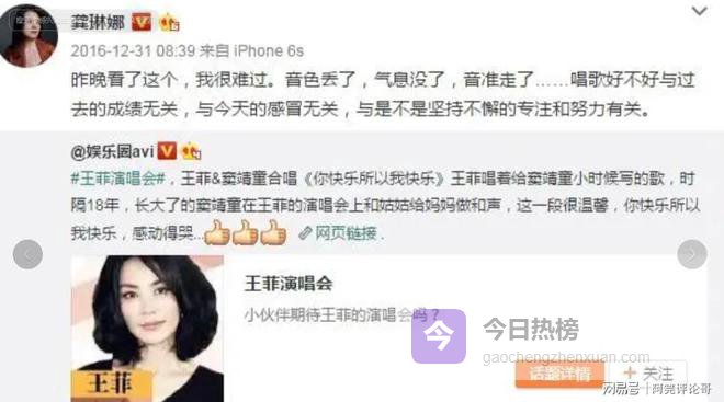 龚琳娜那天发了条微博,八个字:“音色丢了,气息没了。”就因为这八个字,她被王菲粉丝骂了整整一年,外号都给人起好了,叫“粪老师”。
