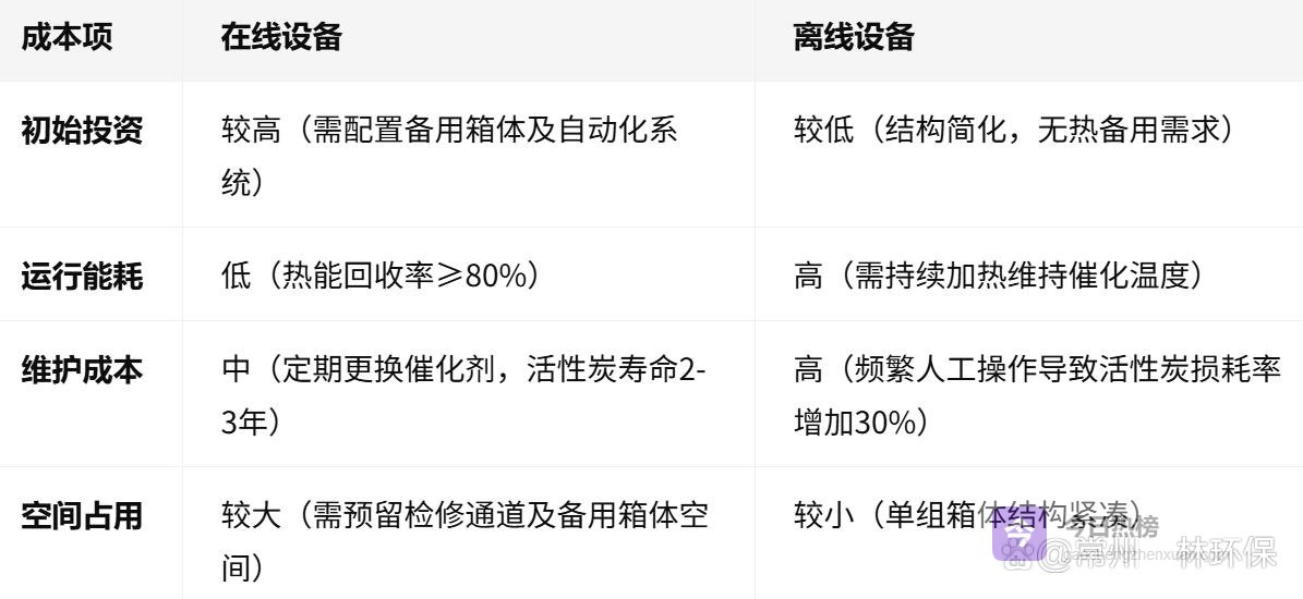 技术局限:离线设备无法实现能量自平衡,需持续消耗电能维持催化燃烧温度。某电子厂案例显示,其离线设备日均耗电量比在线设备高40%,且需配备专职操作人员完成活性炭更换。