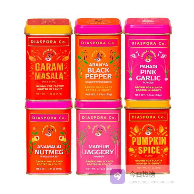 这款六件装的 感恩节必备香料 包含了一系列令人兴奋的香料,节日过后您仍会用到这些香料。包括肉豆蔻、南瓜香料和用整颗黑胡椒制成的黑胡椒粉等厨房必备品。您还会发现粉红大蒜(这是Diaspora Co.的畅销产品)、印度香料混合和马杜尔甘蔗糖,这是一种未经精炼的天然糖,常用于奶茶和其他烘焙食品中。