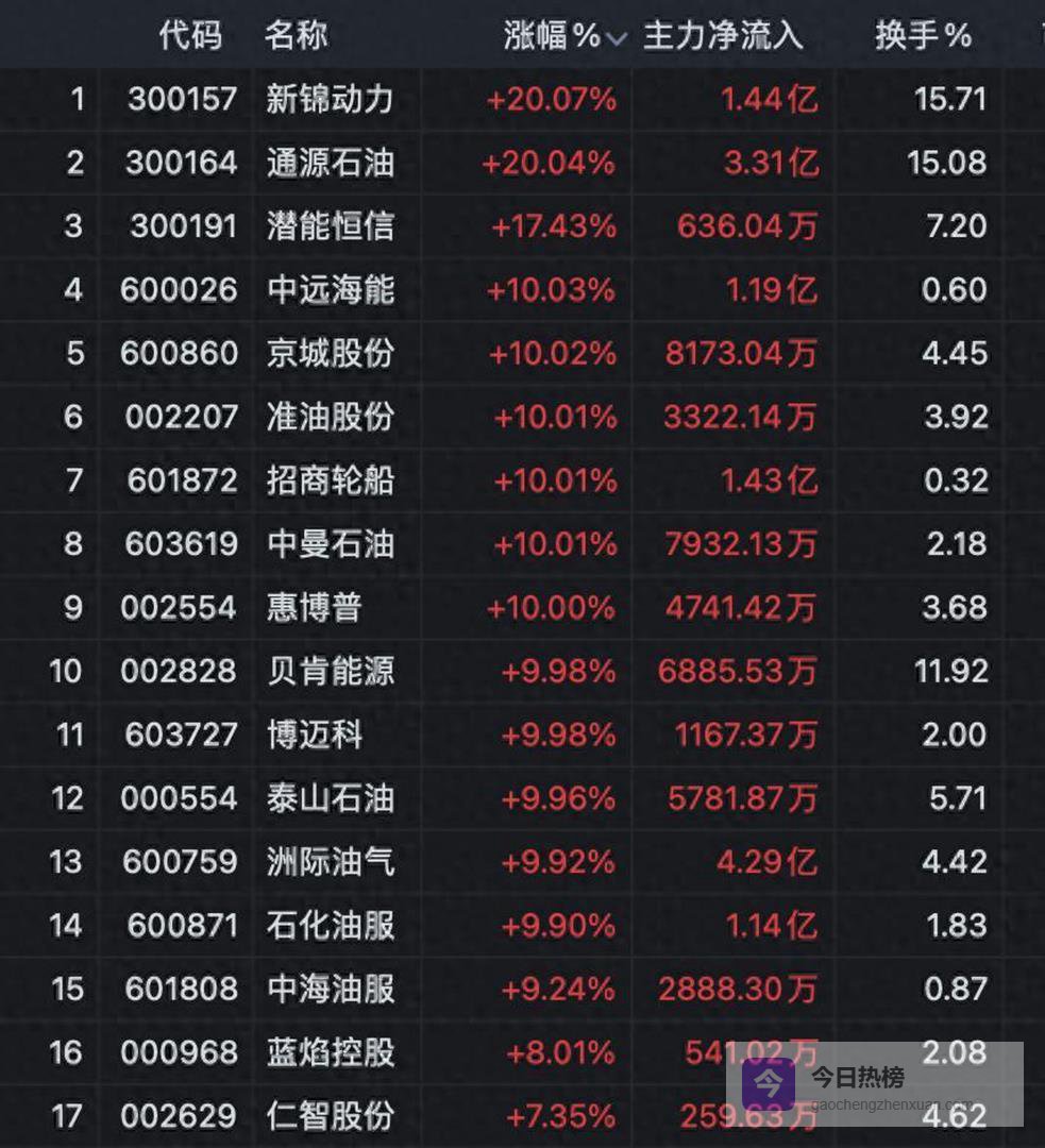 截至当天上午,超过12只石油产业链个股涨停或触及涨停。新锦动力、通源石油以20%的涨幅封死涨停板,潜能恒信暴涨超过17%,准油股份、中曼石油、惠博普、贝肯能源、石化油服、泰山石油等十余只股票也纷纷涨停。板块内个股呈现普涨格局,资金涌入迹象非常明显。