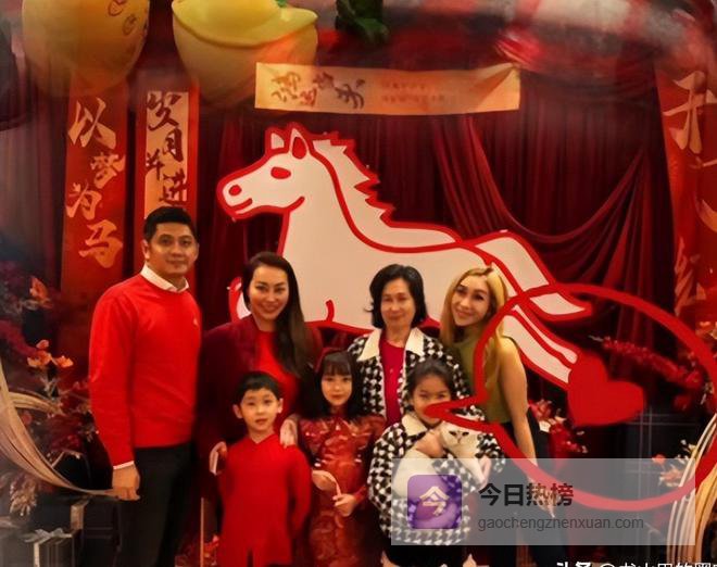 邱咏筠是香港富商邱达昌的长女,现在是帝盛酒店集团的总裁,她带着未婚夫和一对子女来拜年,一家人都穿了红色衣服,喜气洋洋的,几个人还一起在马年背景墙前合了影。