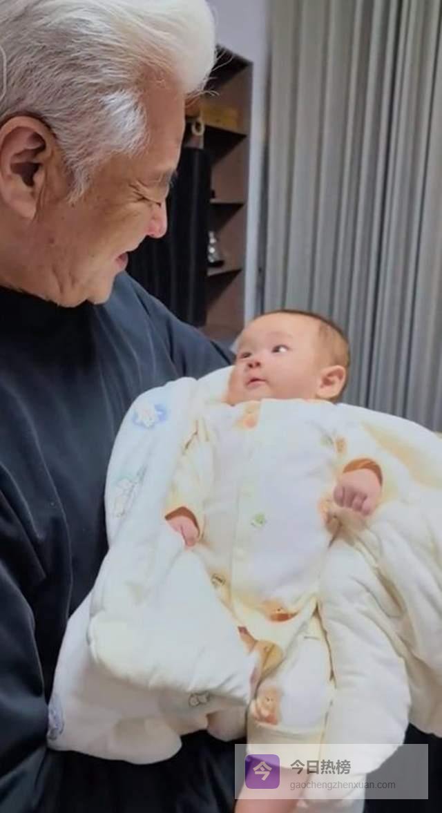 怀中抱着小孙子的颜世魁,双手稳稳托住小孙子的背部和臀部,动作轻柔而充满呵护,嘴角微扬,神情满是温和的他,眼神专注地凝视着怀中的孩子,时不时还发出轻柔的声音与小孙子互动,一举一动之间满是慈爱。