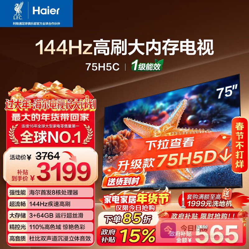 海尔【小红花电视-绽放版】75H5C 75英寸 8核 144Hz高刷 3+64GB 游戏 护眼 国家补贴一级能效 京东自营¥