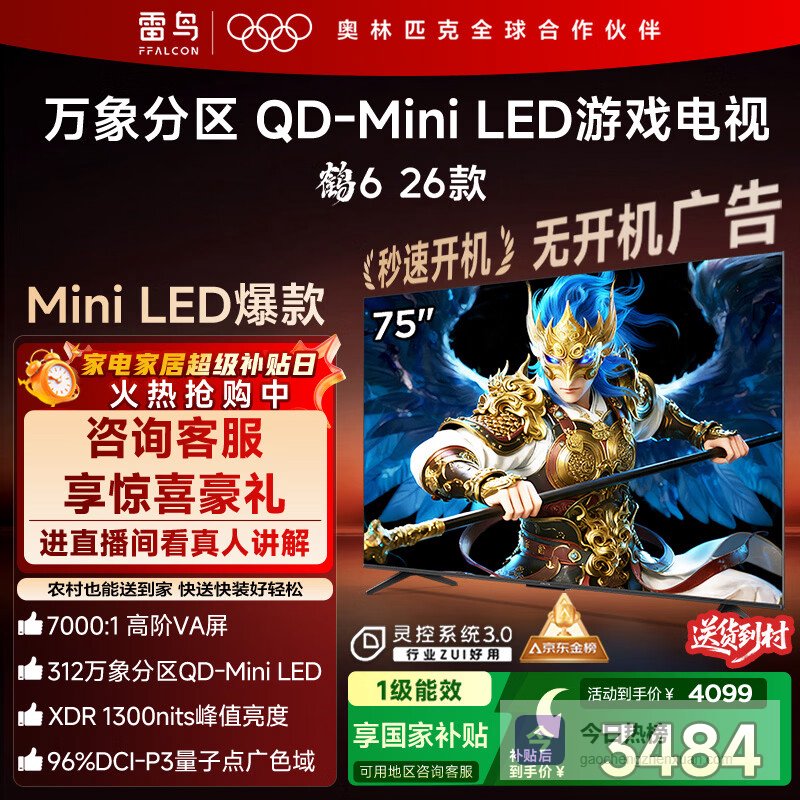 FFALCON雷鸟鹤6 26款 75英寸 万象分区QD-MiniLED1300nits 高阶VA安桥音响288Hz高刷 平板游戏电视75R69A¥