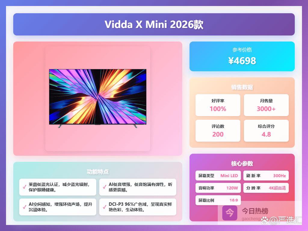 75寸智能电视哪款好,口碑好的几款品牌型号分享一、Vidda① 高清画质:这款Vidda X Mini 2026款采用Mini LED背光技术,能带来更准确、更丰富的色彩表现。配合超高清的4K分辨率,画面细节特别清晰,不管是电影还是游戏都能呈现出很棒的画质效果。亮度高达1100-1500尼特,光线再亮的环境下都不用担心看不清。