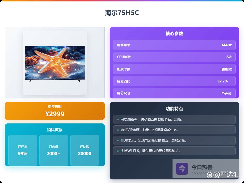 说实话,现在市面上75寸智能电视选择是真的多,但真正性价比高的,还得好好挑挑。我也是踩了不少坑,才慢慢摸清一些门道。与其盲目跟风,不如多看看过来人的经验,结合自己的需求来选。下面给大家挑了8款,感兴趣的可以了解下。