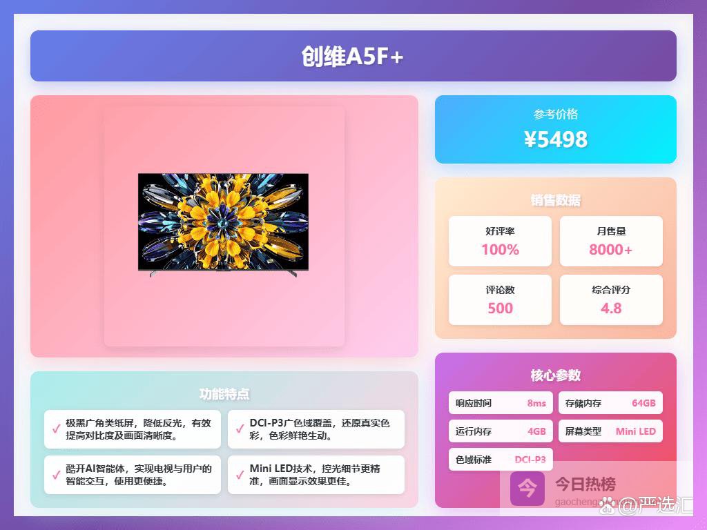 四、创维① 超高清4K大屏:这款创维A5F+采用75英寸的超大屏幕,提供高达3840*2160的4K分辨率,画面细节特别清晰。无论是追剧还是玩游戏,都能享受身临其境的视觉体验,让你在家就像在电影院一样看得尽兴。