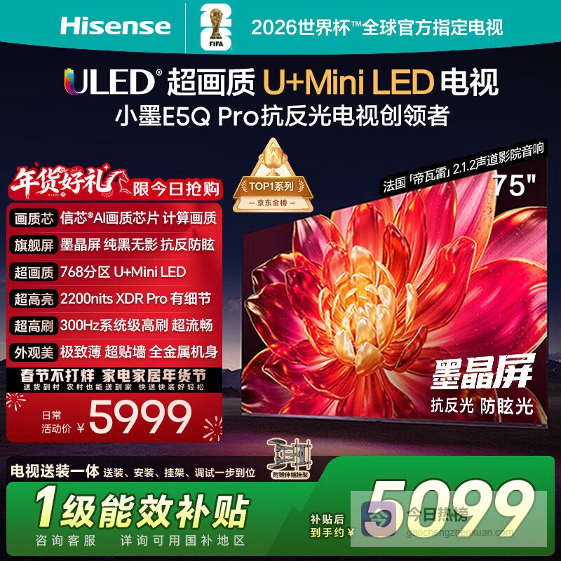 海信电视小墨E5Q Pro 75英寸【送装一体-伸缩挂架】768分区U+MiniLED 信芯芯片抗反光防眩光世界杯¥