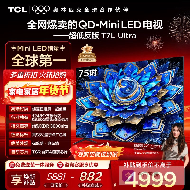 TCL电视 75T7L Ultra 75英寸 QD-Mini LED 蝶翼星曜屏 万象分区 绚彩XDR 3000nits 超薄 国家补贴 T7L¥