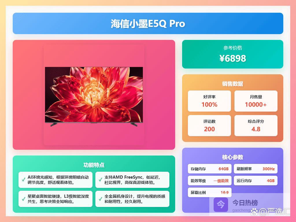 五、海信① 超高清大屏:这款海信小墨E5Q Pro配备了75英寸超大屏幕,分辨率是4K超高清,在观看电影、追剧或者玩游戏时,画面细节更清晰,体验也更沉浸。无论是家庭影院还是游戏娱乐,都能带来震撼的视觉享受。