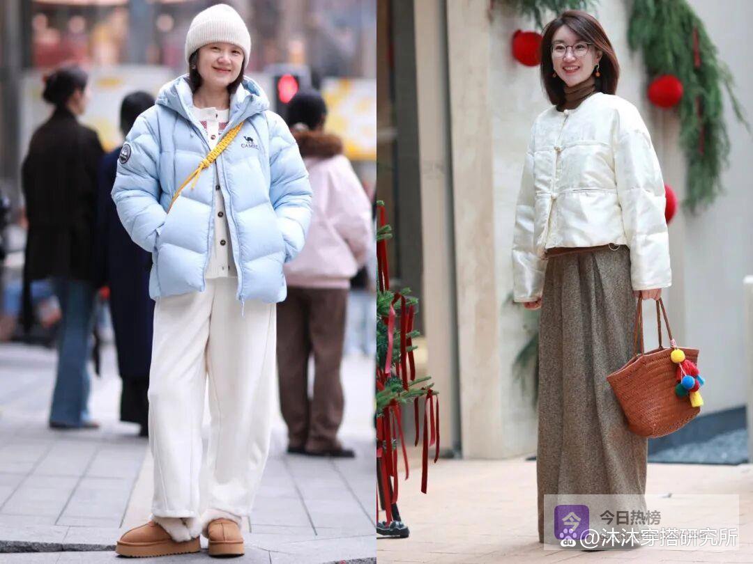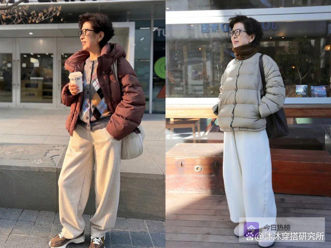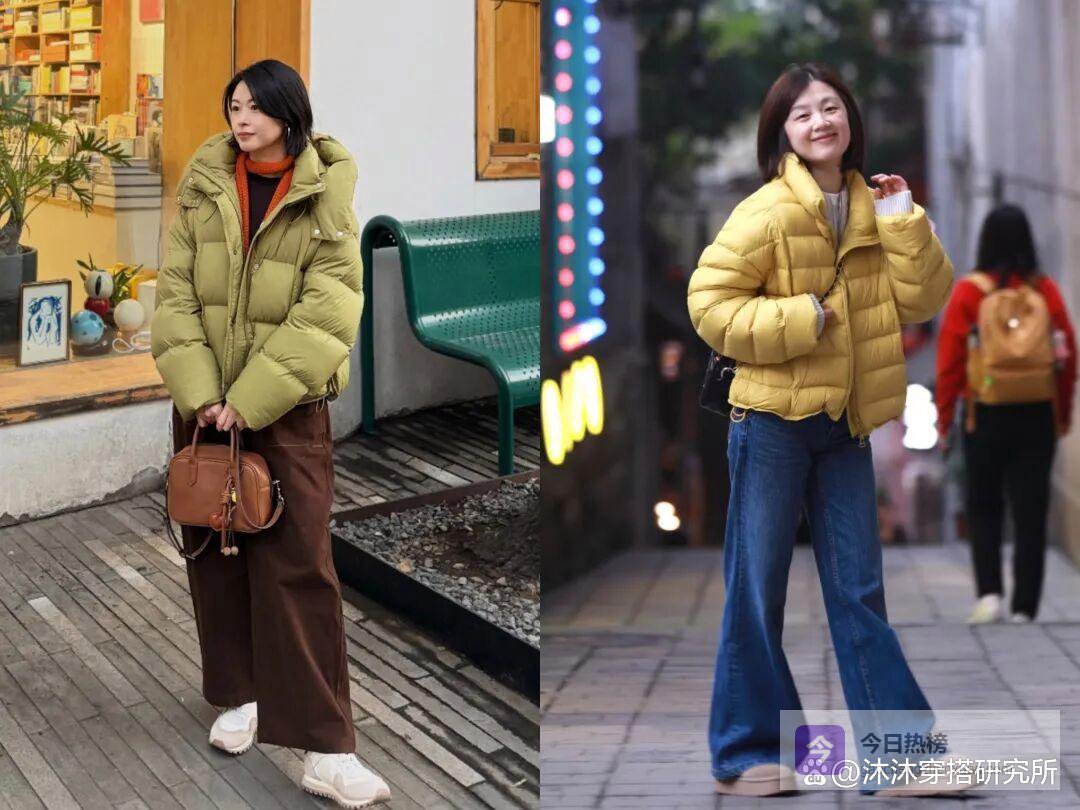 像羽绒服配阔腿裤就是一个非常不错的选择,一定要选择垂感好、线条利落的版型。