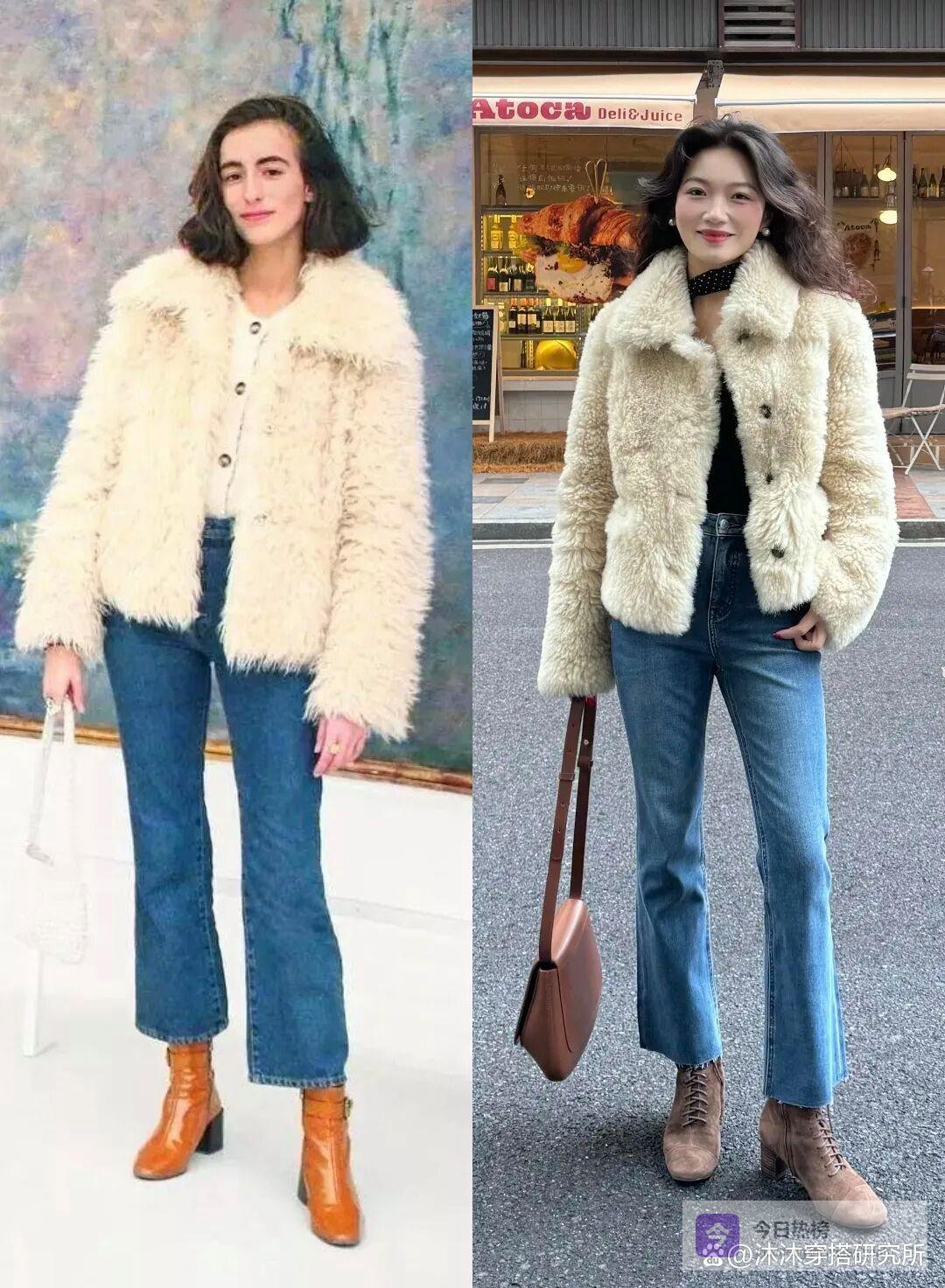 这样能跟蓬松外套形成对比,上松下垂,让整个人看着就不会显得太臃肿。