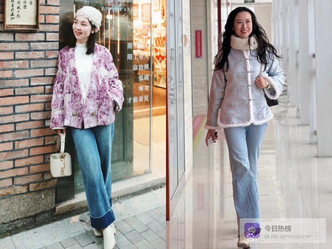 不过呢,我个人觉得新中式的款式,元素一般都比较丰富。所以呢,过年想穿得日常一些,秘诀就是要搭配一条牛仔裤。