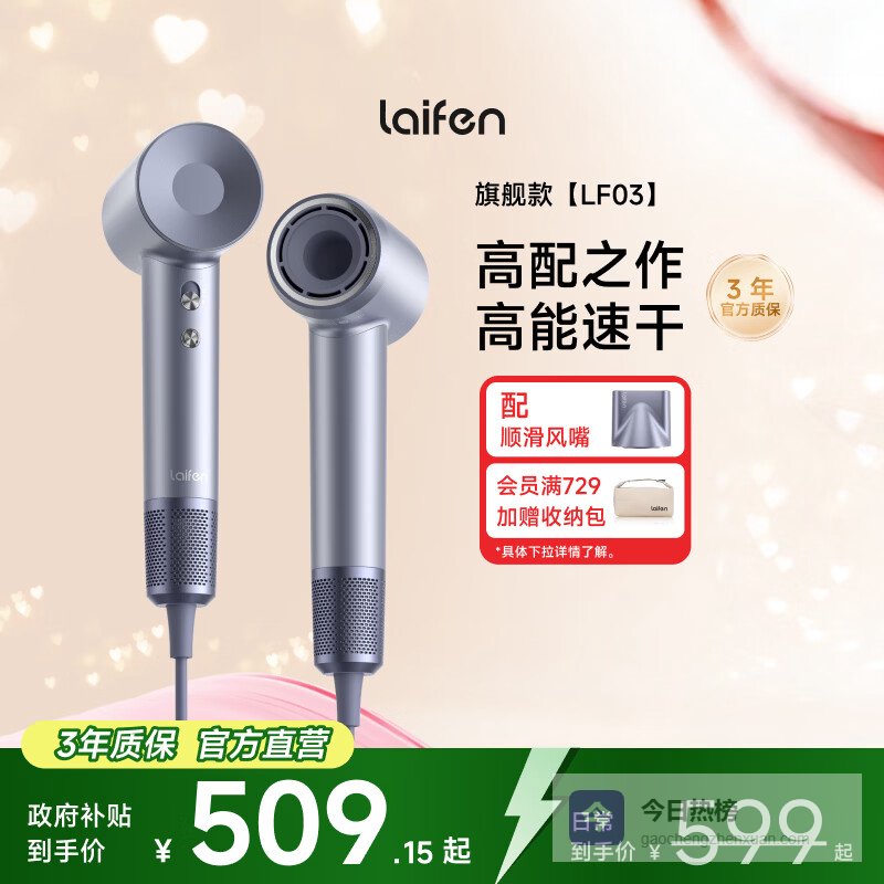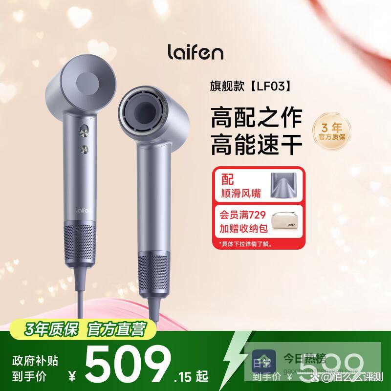 其实啊,对于大多数用户来说,真正需要的不是花里胡哨的功能堆砌,而是一台干得快、吹得柔、用着稳的主力吹风机。在徕芬目前的产品线中,徕芬Laifen家用电吹风LF03就是这样一个“刚刚好”的存在。它拥有高速电机、智能温控、高浓度负离子和轻巧机身,无论是日常干发、周末造型,还是出差旅行,都能提供高效又护发的体验。真正做到了“热门机型,速看避坑指南”。